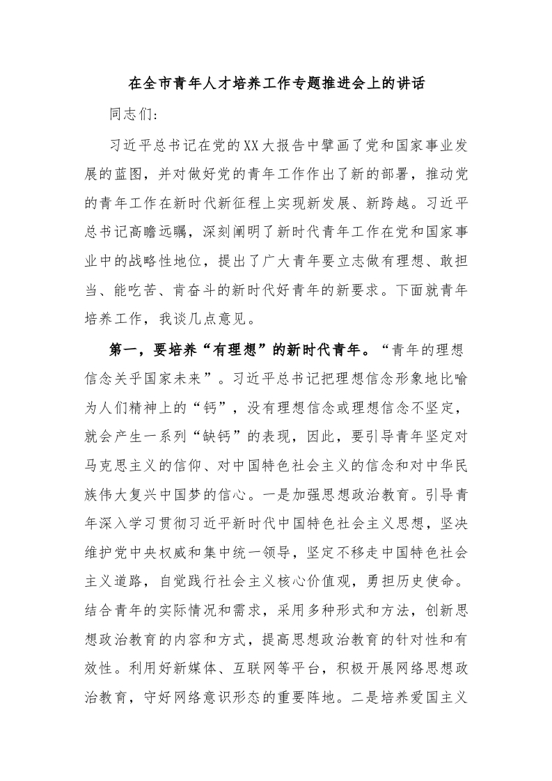 / 在全市青年人才培养工作专题推进会上的讲话