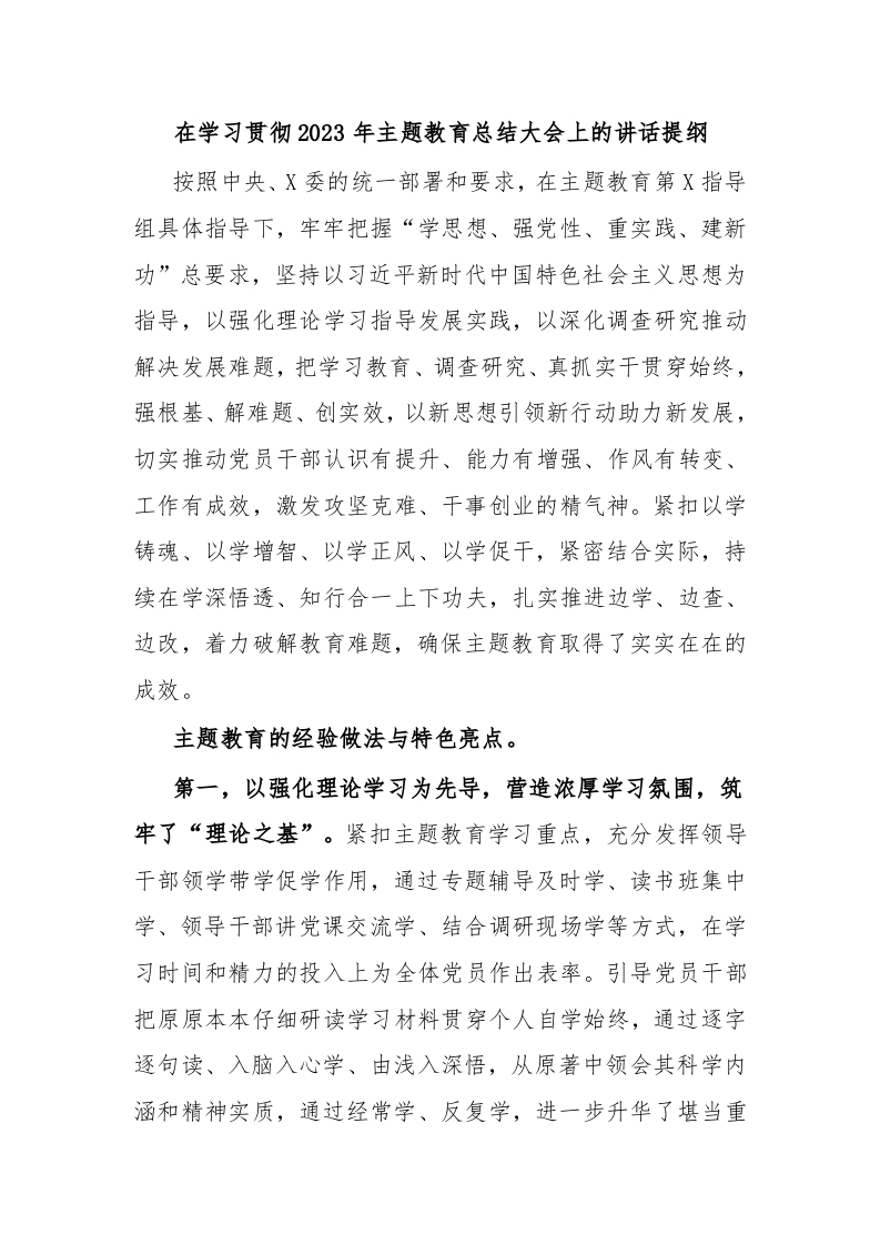 / 在学习贯彻2023年主题教育总结大会上的讲话提纲