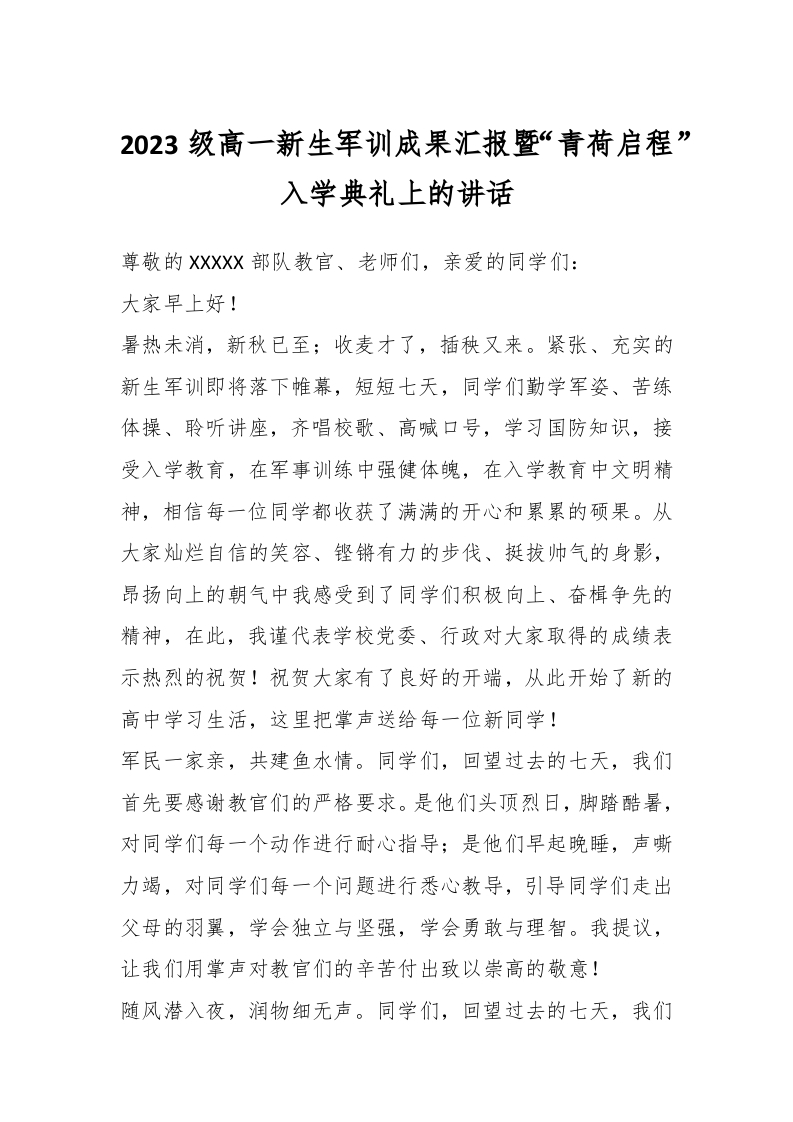 2023级高一新生军训成果汇报暨“青荷启程”入学典礼上的讲话