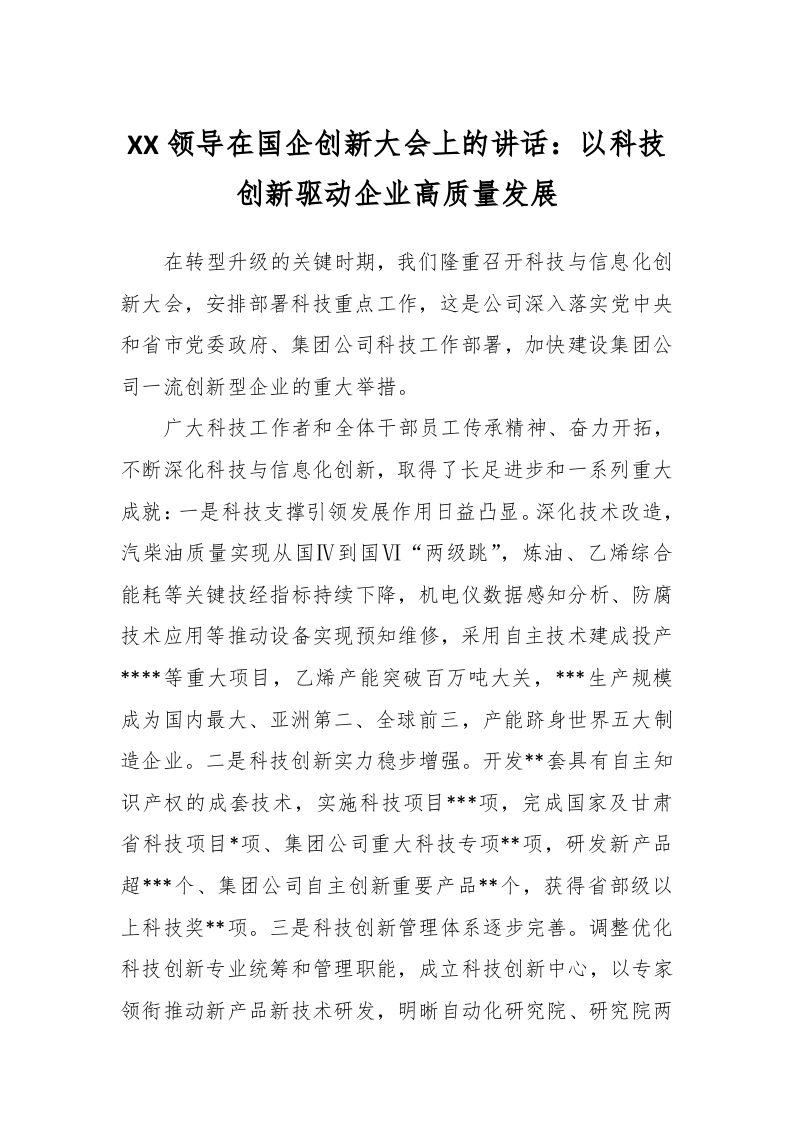 / XX领导在国企创新大会上的讲话:以科技创新驱动企业高质量发展