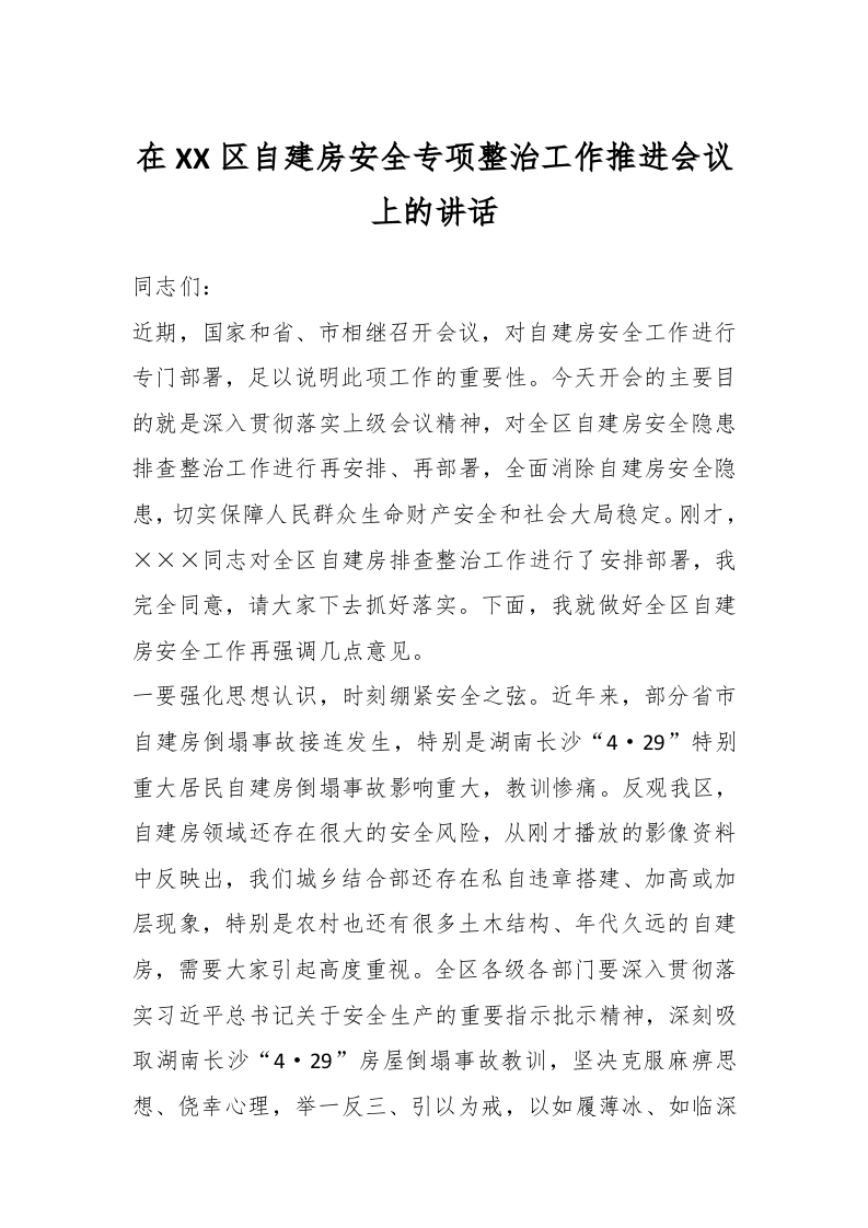 / 在XX区自建房安全专项整治工作推进会议上的讲话