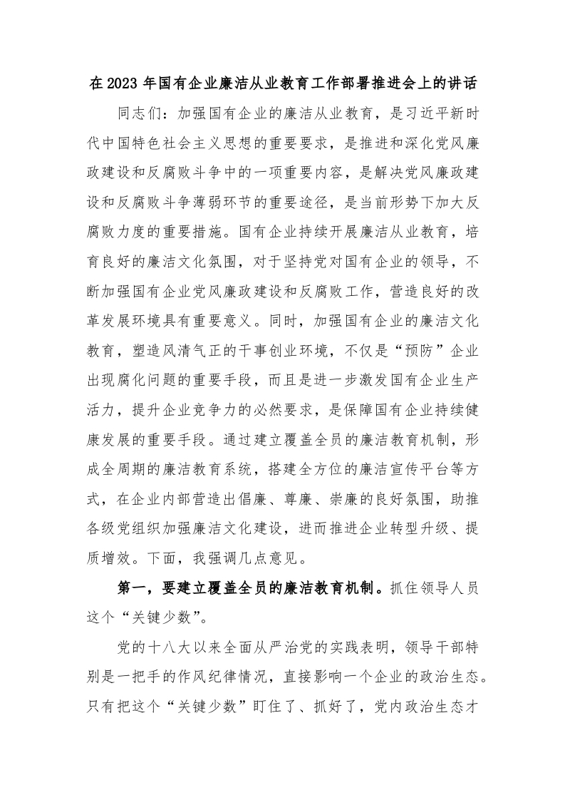 / 在2023年国有企业廉洁从业教育工作部署推进会上的讲话