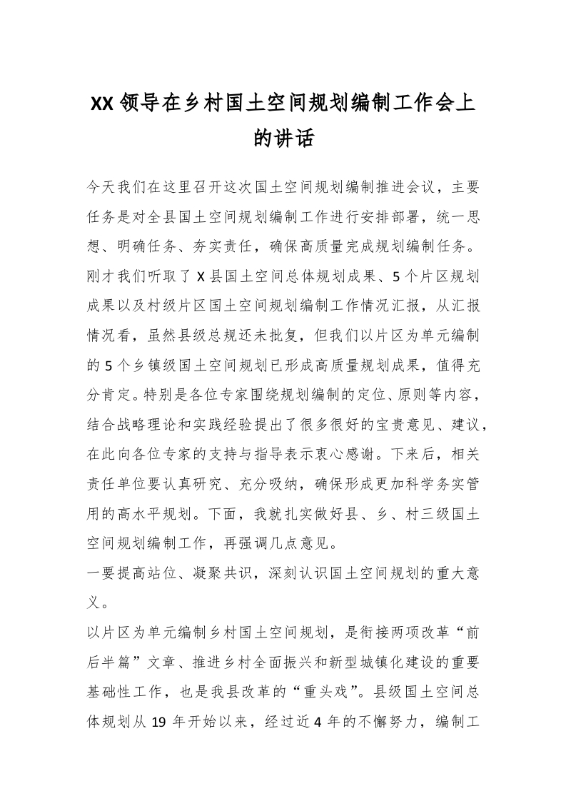 XX领导在乡村国土空间规划编制工作会上的讲话