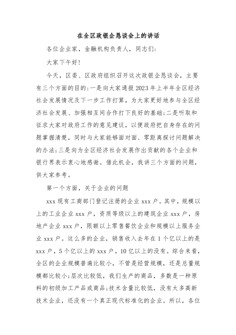 / 在全区政银企恳谈会上的讲话