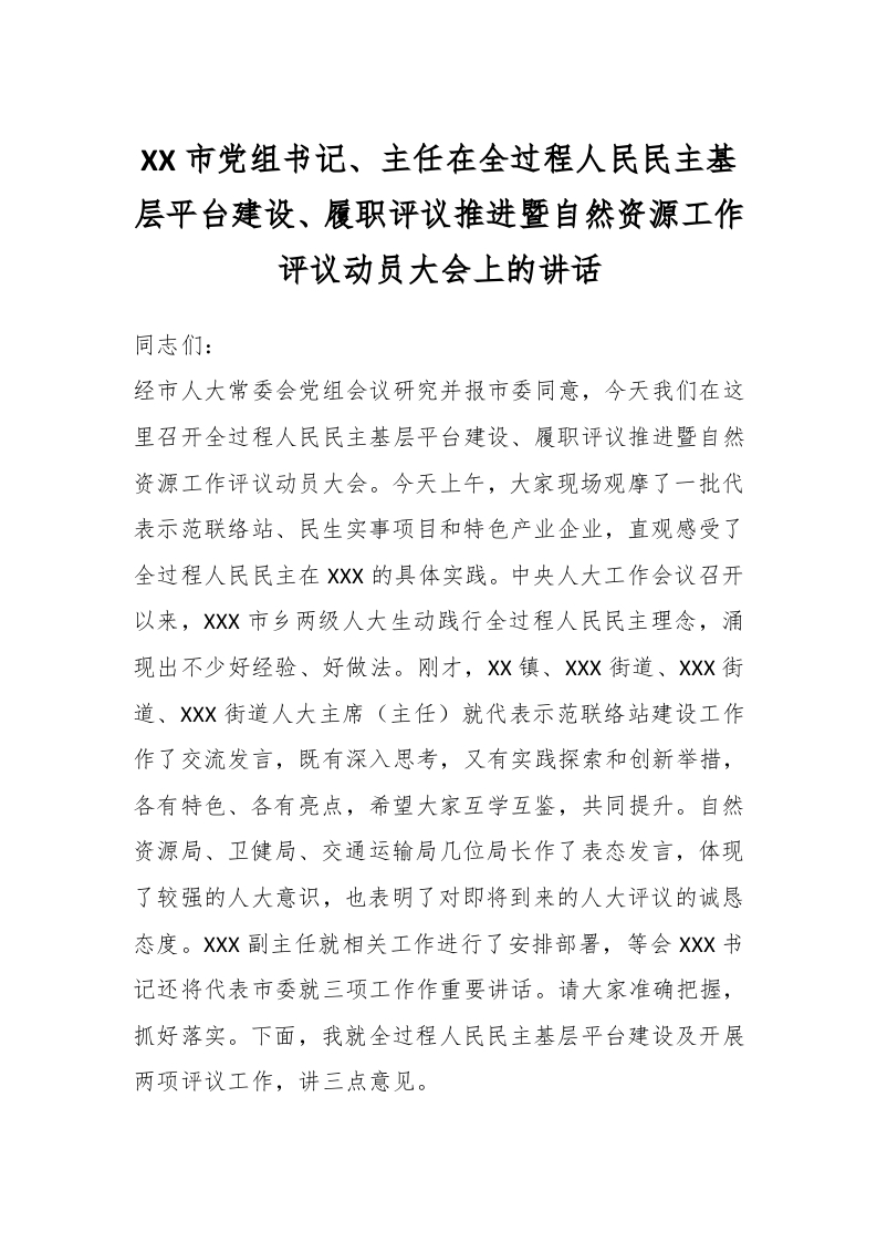 XX市党组书记、主任在全过程人民民主基层平台建设、履职评议推进暨自然资源工作评议动员大会上的讲话
