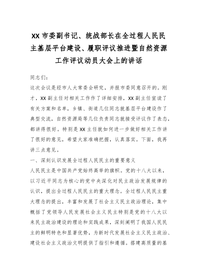 / XX市委副书记、统战部长在全过程人民民主基层平台建设、履职评议推进暨自然资源工作评议动员大会上的讲话