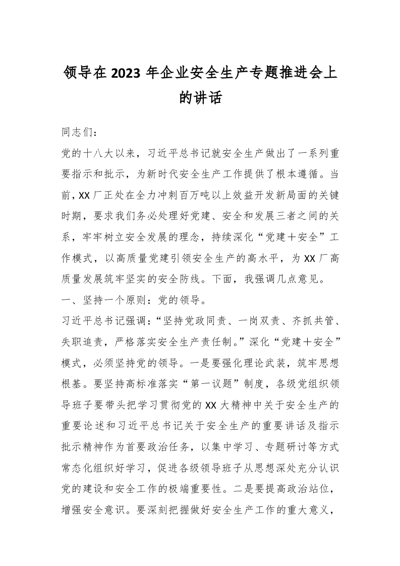 / 领导在2023年企业安全生产专题推进会上的讲话