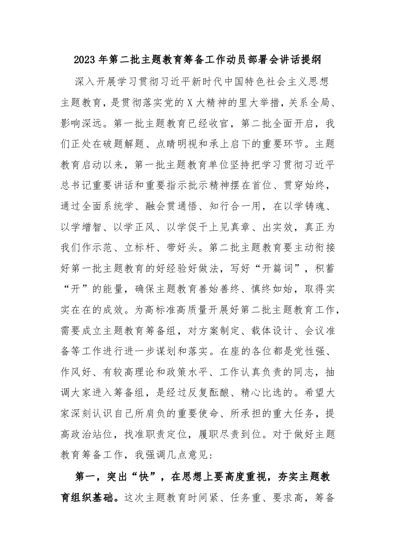 / 2023年第二批主题教育筹备工作动员部署会讲话提纲
