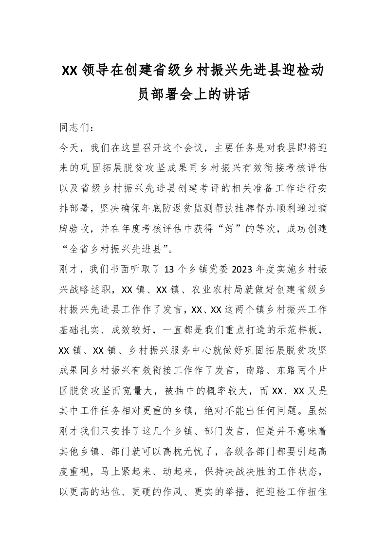 / XX领导在创建省级乡村振兴先进县迎检动员部署会上的讲话