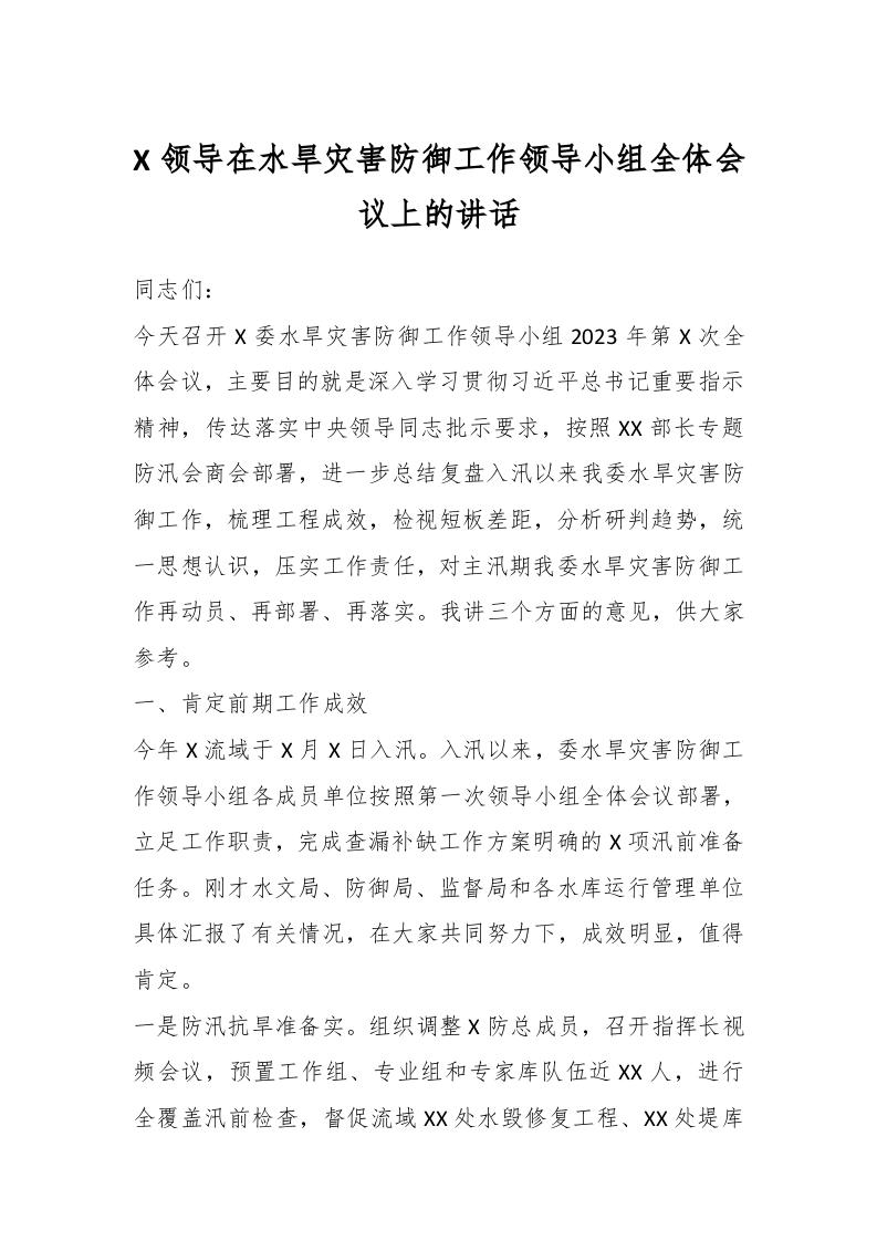 / X领导在水旱灾害防御工作领导小组全体会议上的讲话