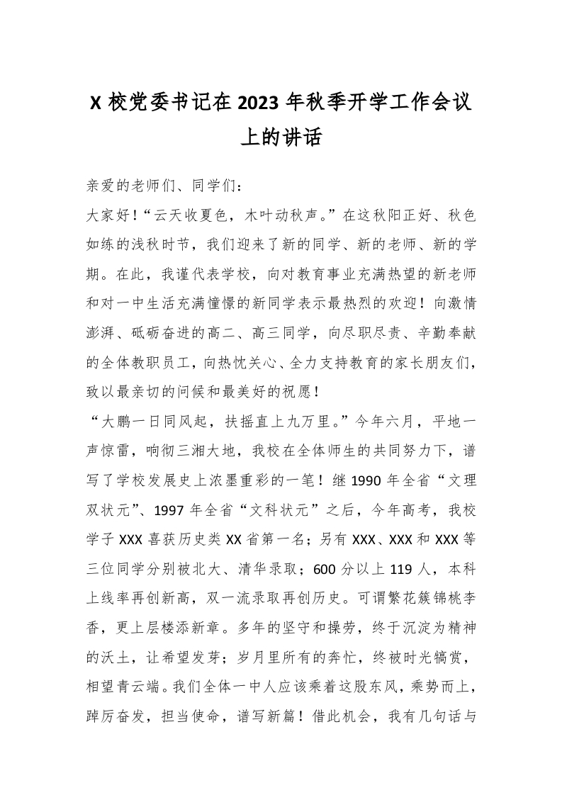 / X校党委书记在2023年秋季开学工作会议上的讲话