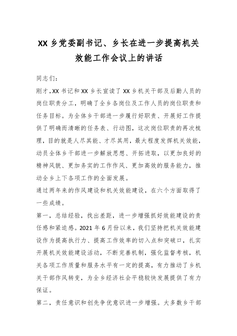 / XX乡党委副书记、乡长在进一步提高机关效能工作会议上的讲话