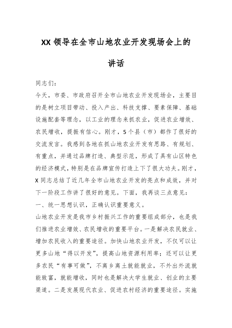 / XX领导在全市山地农业开发现场会上的讲话