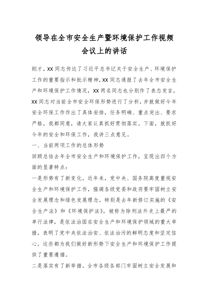 / 领导在全市安全生产暨环境保护工作视频会议上的讲话