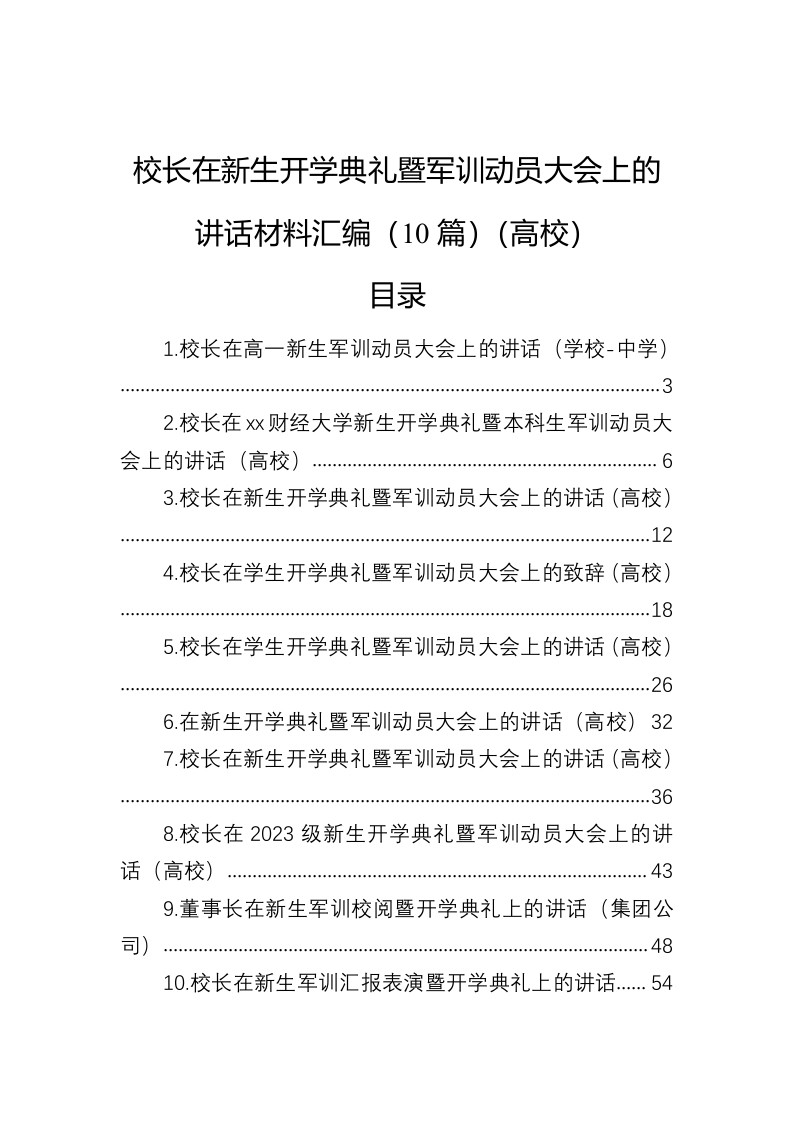 / 校长在新生开学典礼暨军训动员大会上的讲话材料汇编(10篇)(高校)