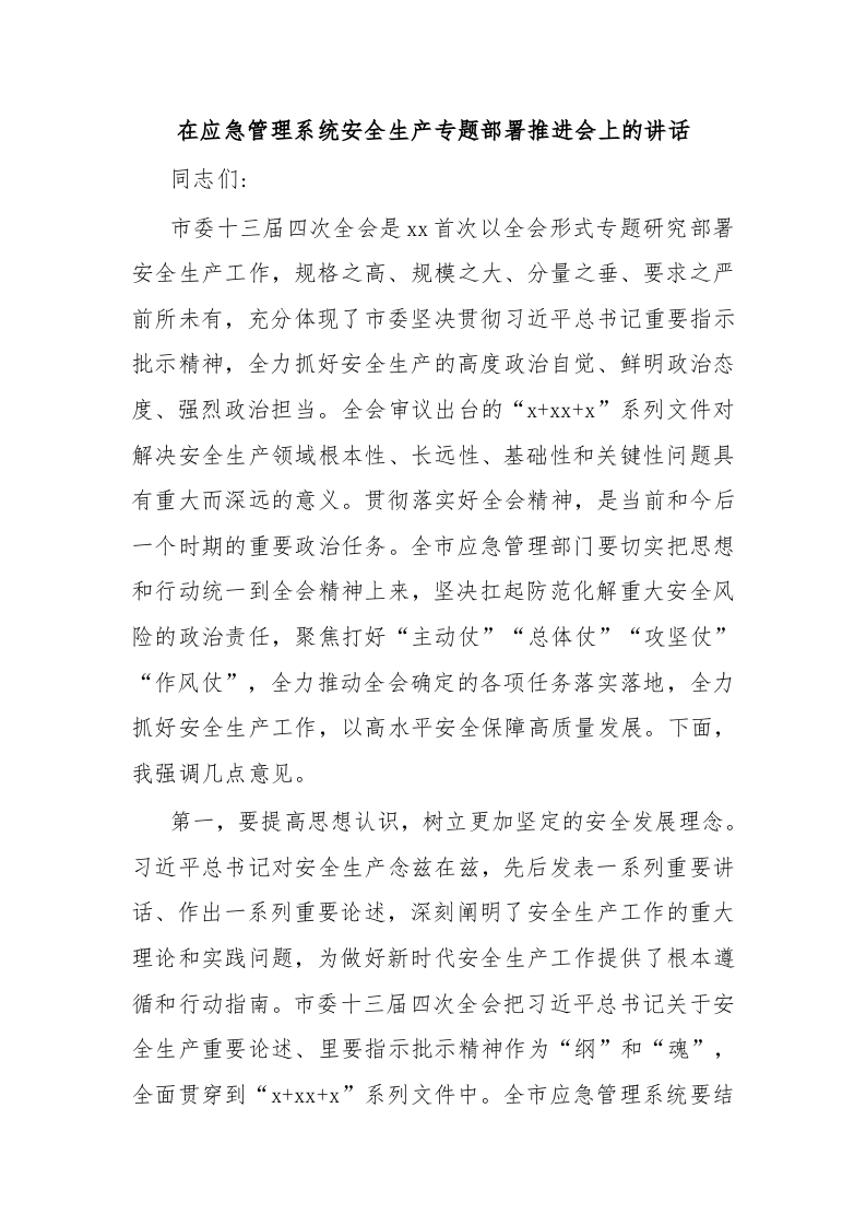 / 在应急管理系统安全生产专题部署推进会上的讲话