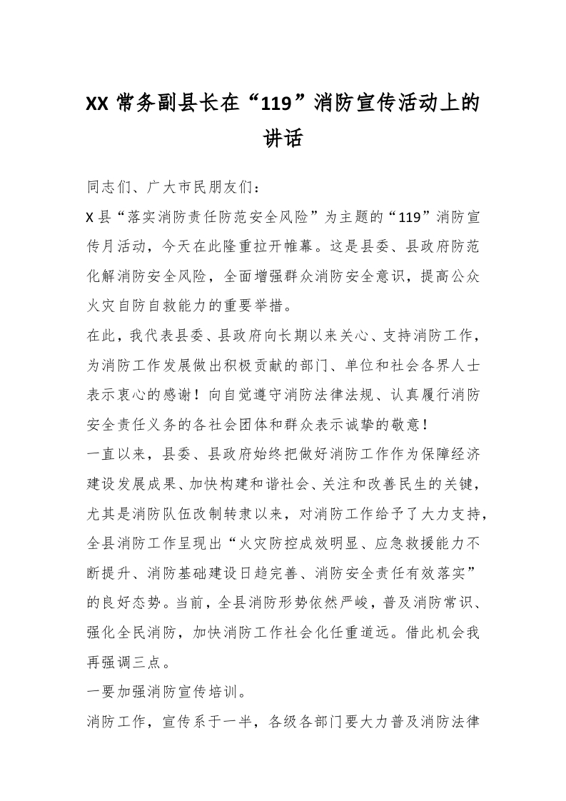 / XX常务副县长在“119”消防宣传活动上的讲话