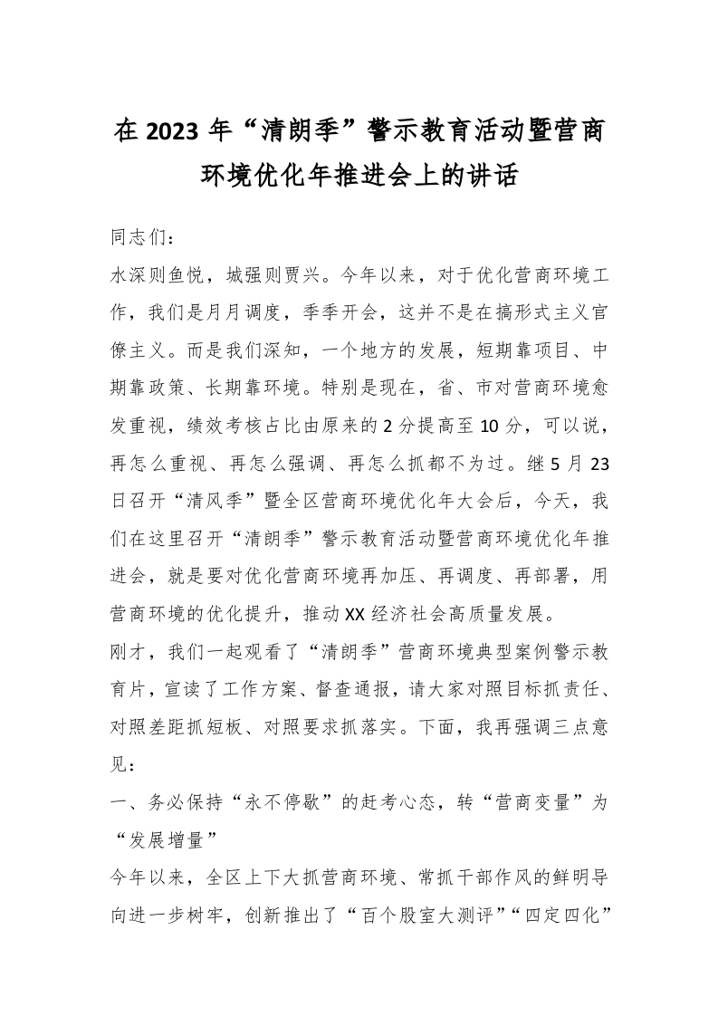 / 在2023年“清朗季”警示教育活动暨营商环境优化年推进会上的讲话