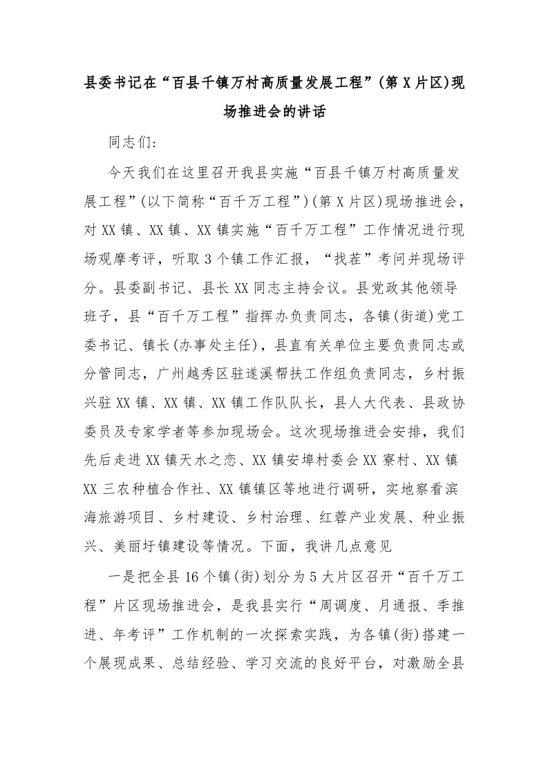/ 县委书记在“百县千镇万村高质量发展工程”(第X片区)现场推进会的讲话