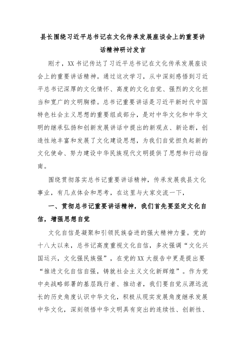 / 县长围绕习近平总书记在文化传承发展座谈会上的重要讲话精神研讨发言