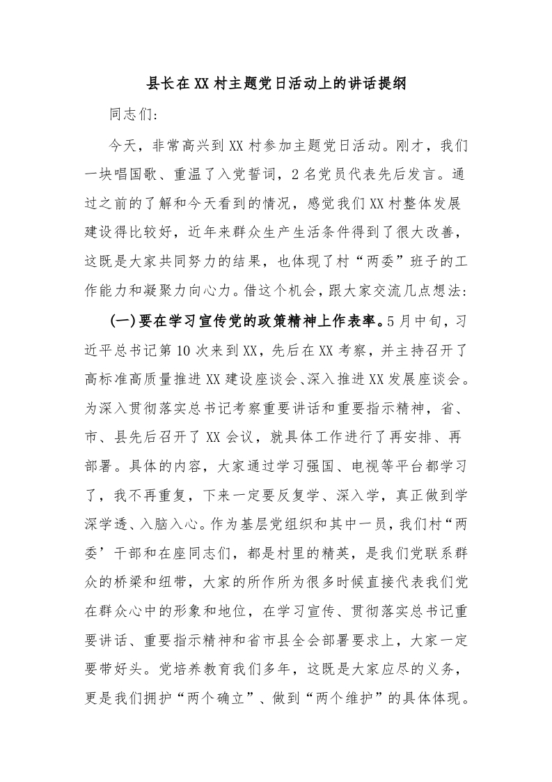 / 县长在XX村主题党日活动上的讲话提纲