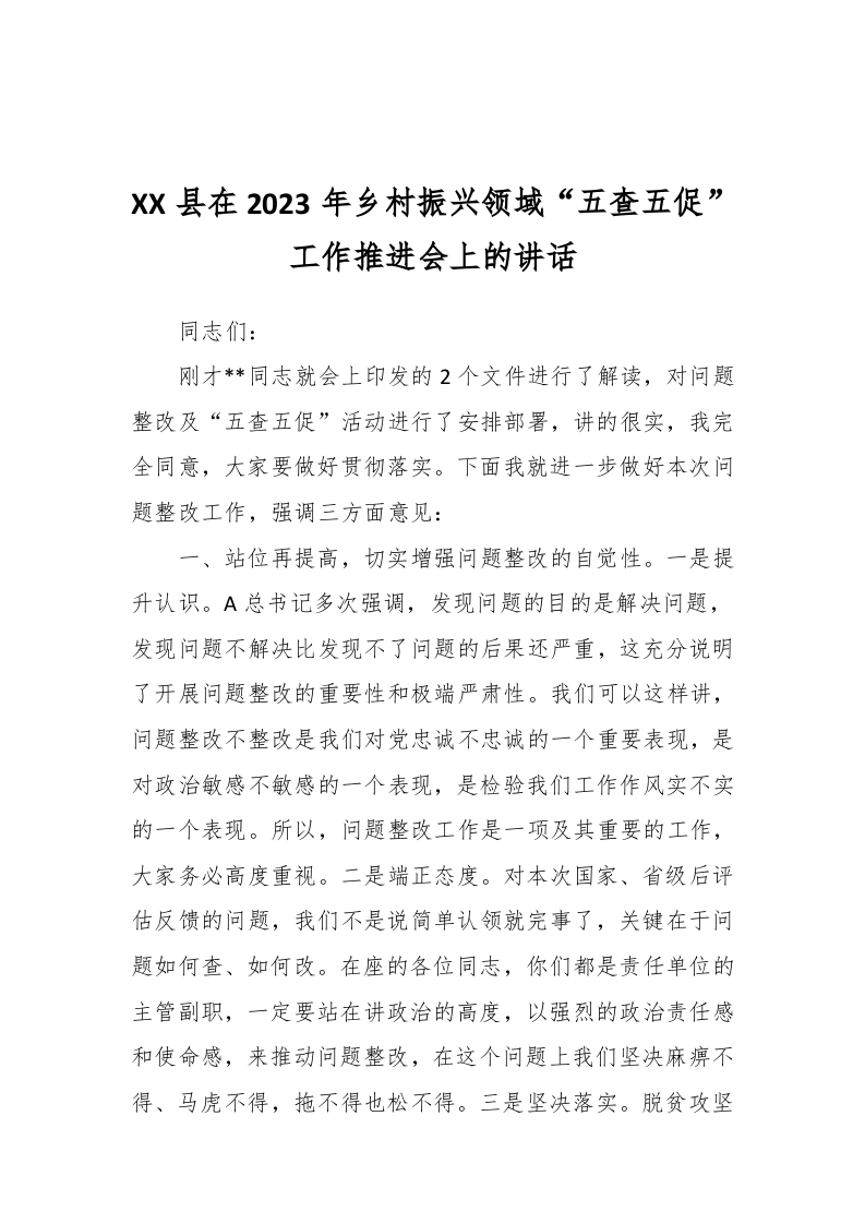 XX县在2023年乡村振兴领域“五查五促”工作推进会上的讲话