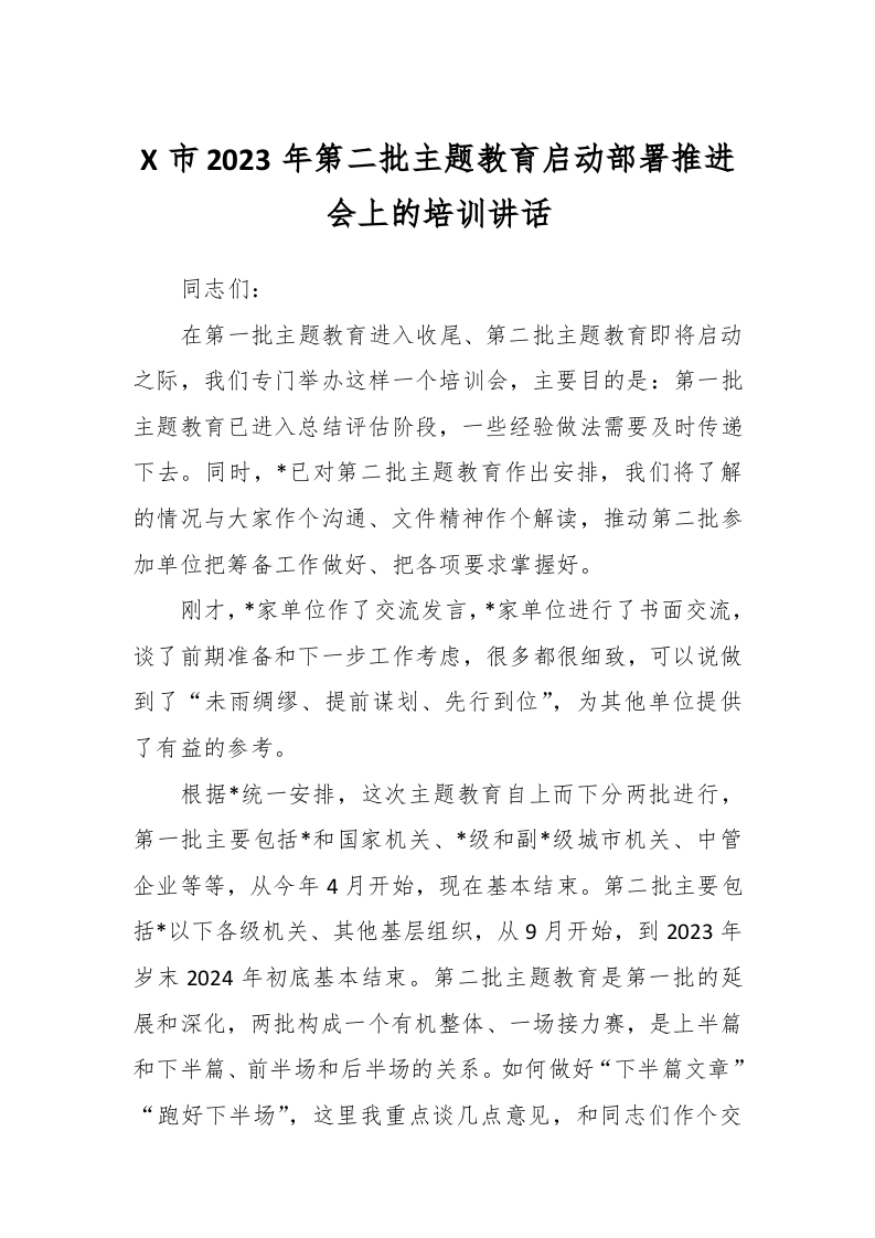 / X市2023年第二批主题教育启动部署推进会上的培训讲话