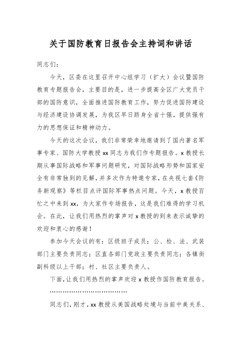 / 关于国防教育日报告会主持词和讲话
