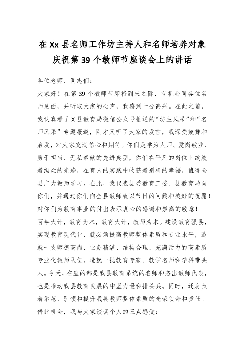 / 在Xx县名师工作坊主持人和名师培养对象庆祝第39个教师节座谈会上的讲话