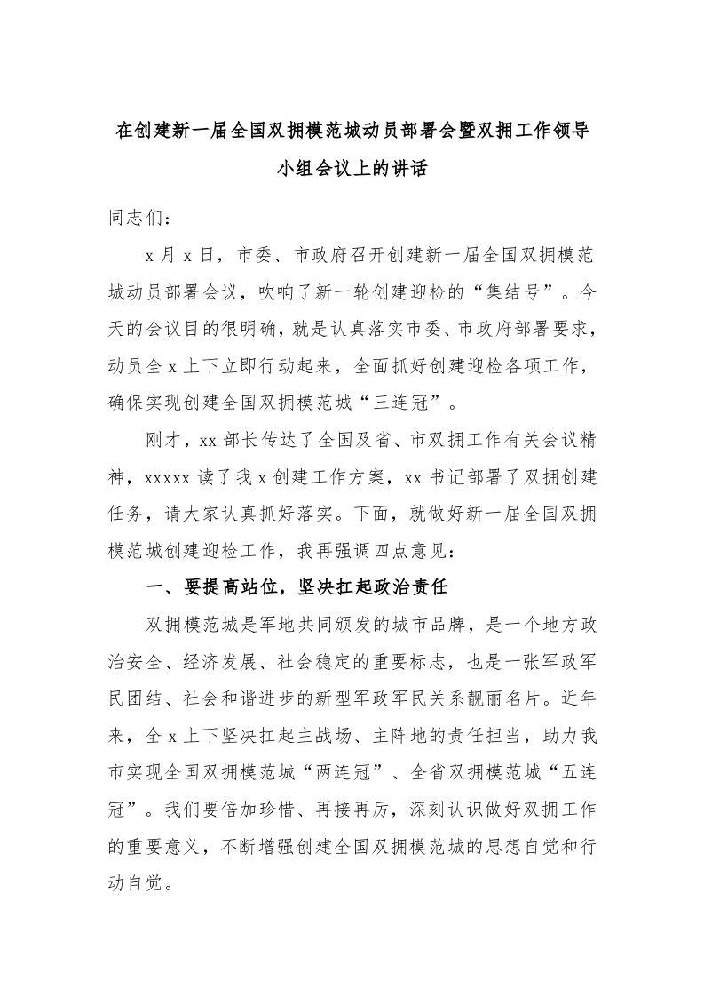 / 在创建新一届全国双拥模范城动员部署会暨双拥工作领导小组会议上的讲话