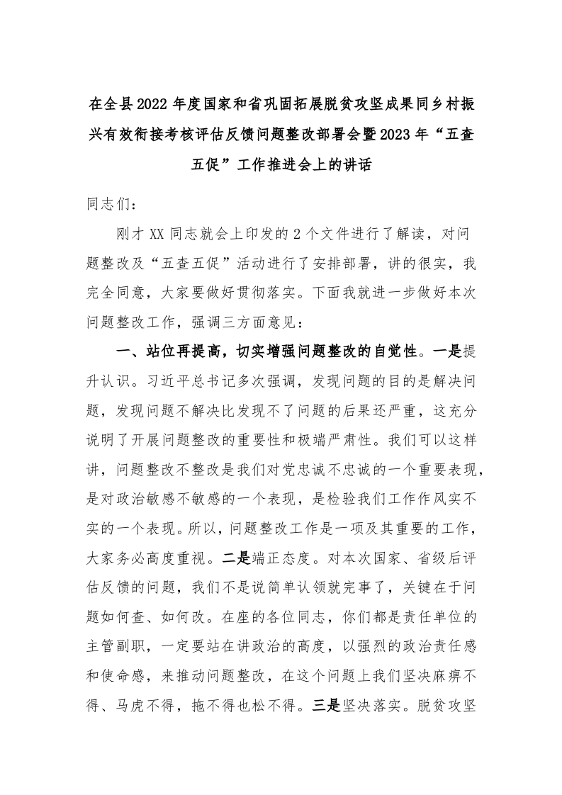 在全县2022年度国家和省巩固拓展脱贫攻坚成果同乡村振兴有效衔接考核评估反馈问题整改部署会暨2023年“五查五促”工作推进会上的讲话