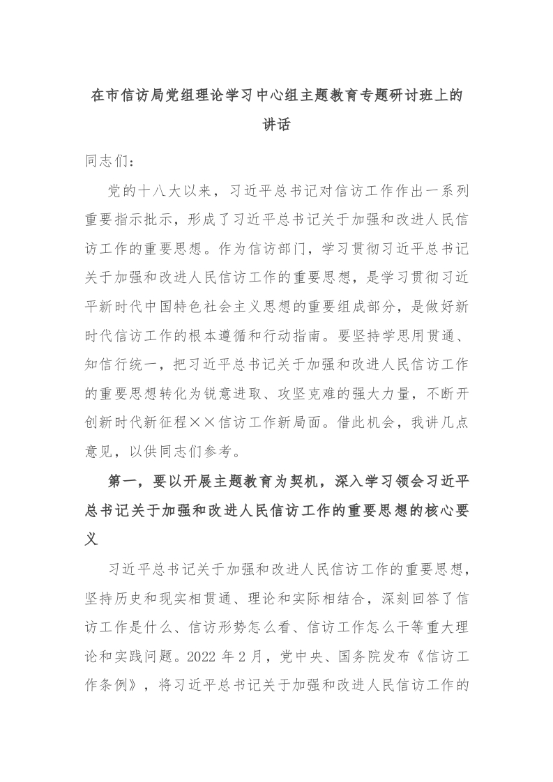 / 在市信访局党组理论学习中心组主题教育专题研讨班上的讲话