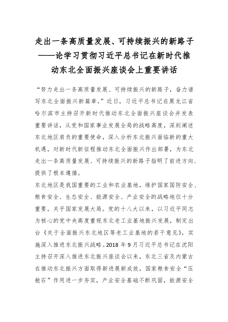 / 走出一条高质量发展、可持续振兴的新路子——论学习贯彻习近平总书记在新时代推动东北全面振兴座谈会上重要讲话