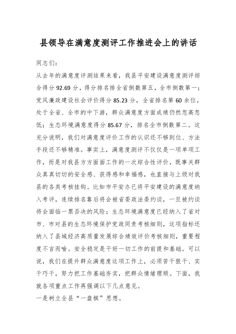 / 县领导在满意度测评工作推进会上的讲话