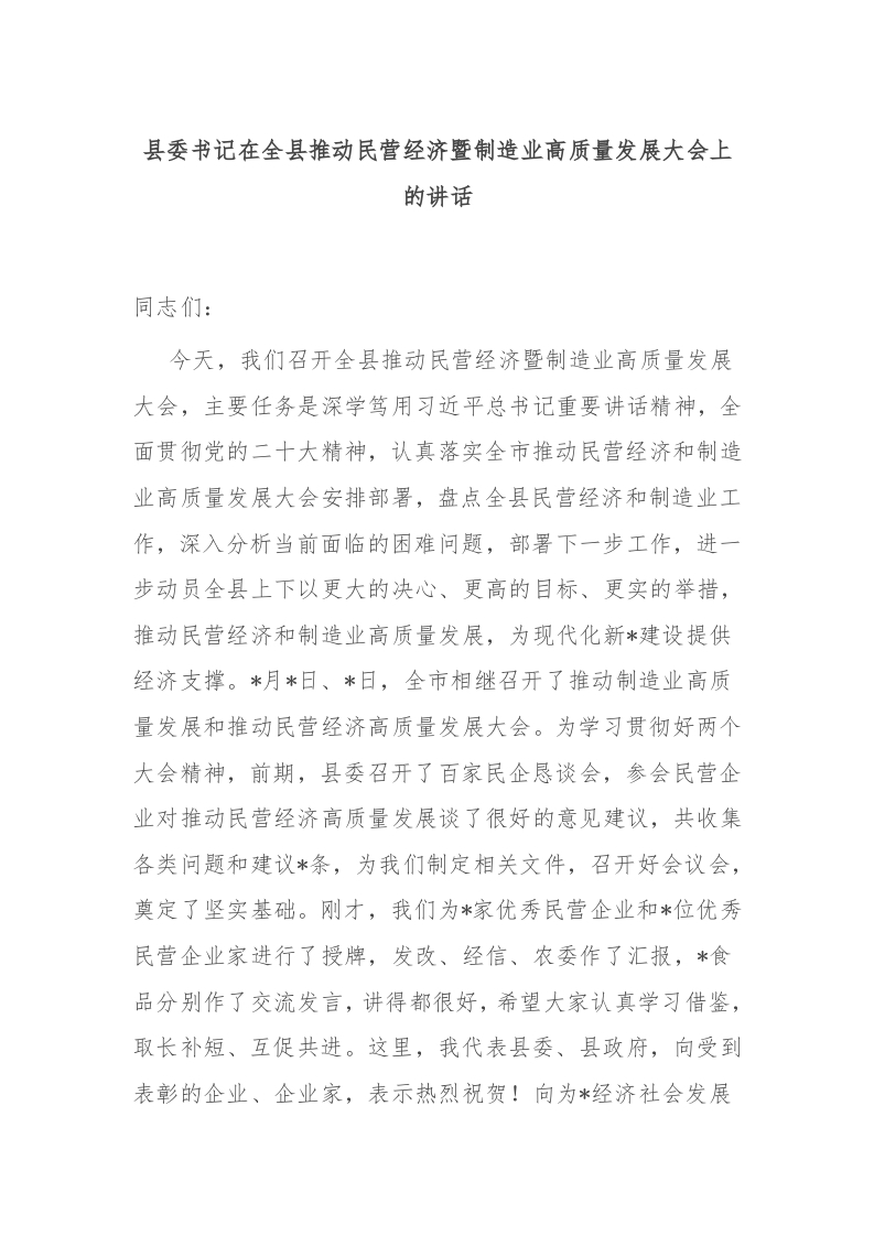 / 县委书记在全县推动民营经济暨制造业高质量发展大会上的讲话