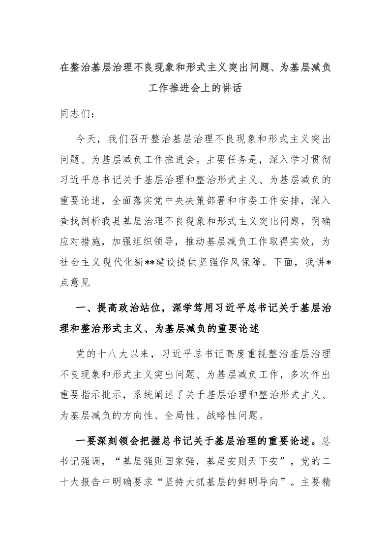 / 在整治基层治理不良现象和形式主义突出问题、为基层减负工作推进会上的讲话