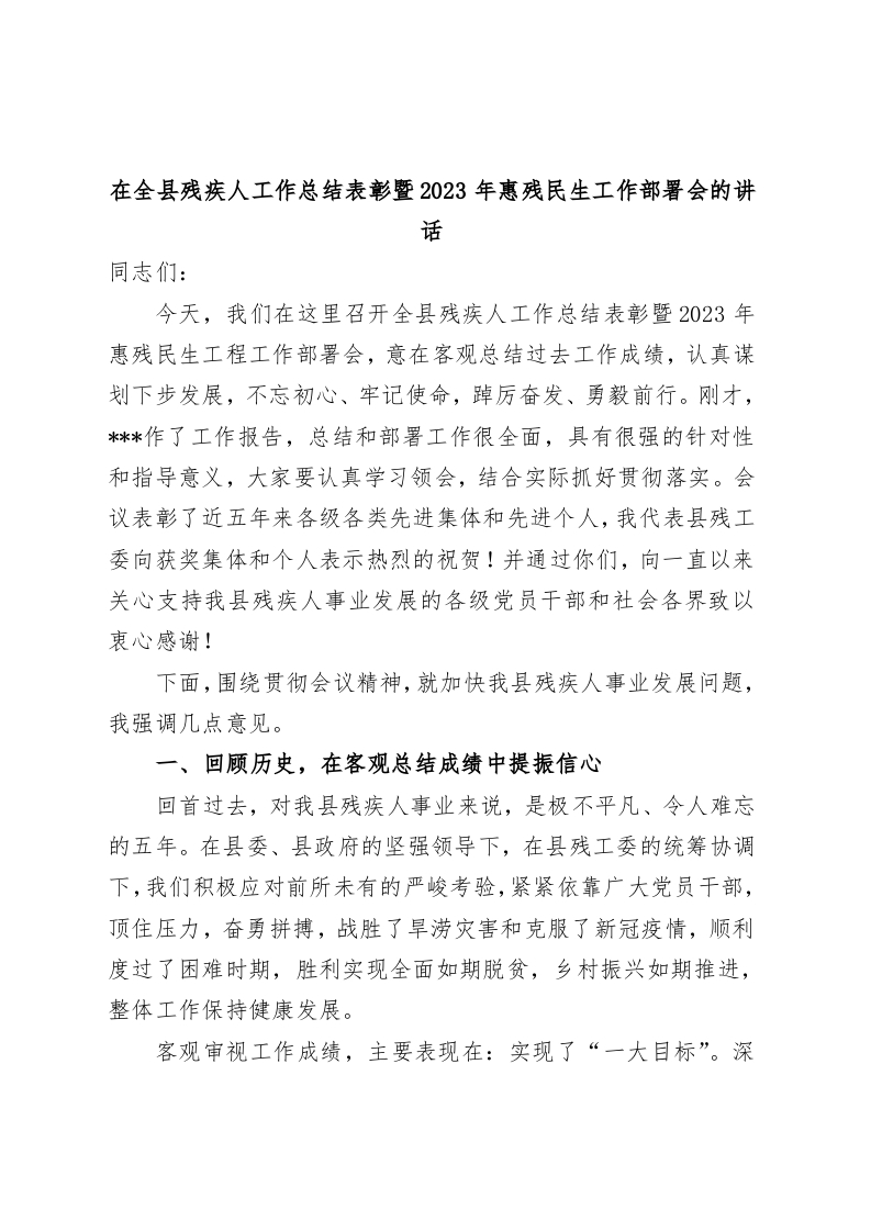 / 在全县残疾人工作总结表彰暨2023年惠残民生工作部署会的讲话