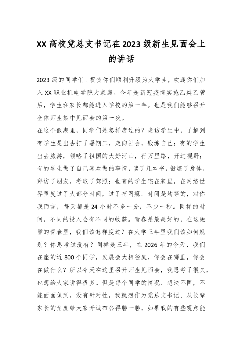 / XX高校党总支书记在2023级新生见面会上的讲话