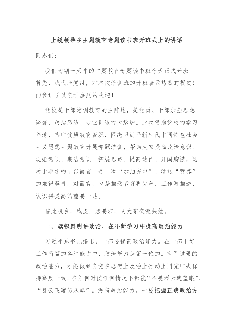 / 上级领导在主题教育专题读书班开班式上的讲话