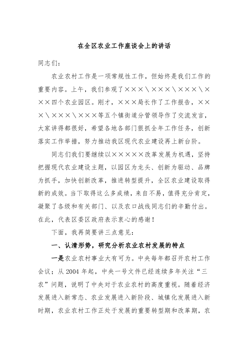 / 在全区农业工作座谈会上的讲话