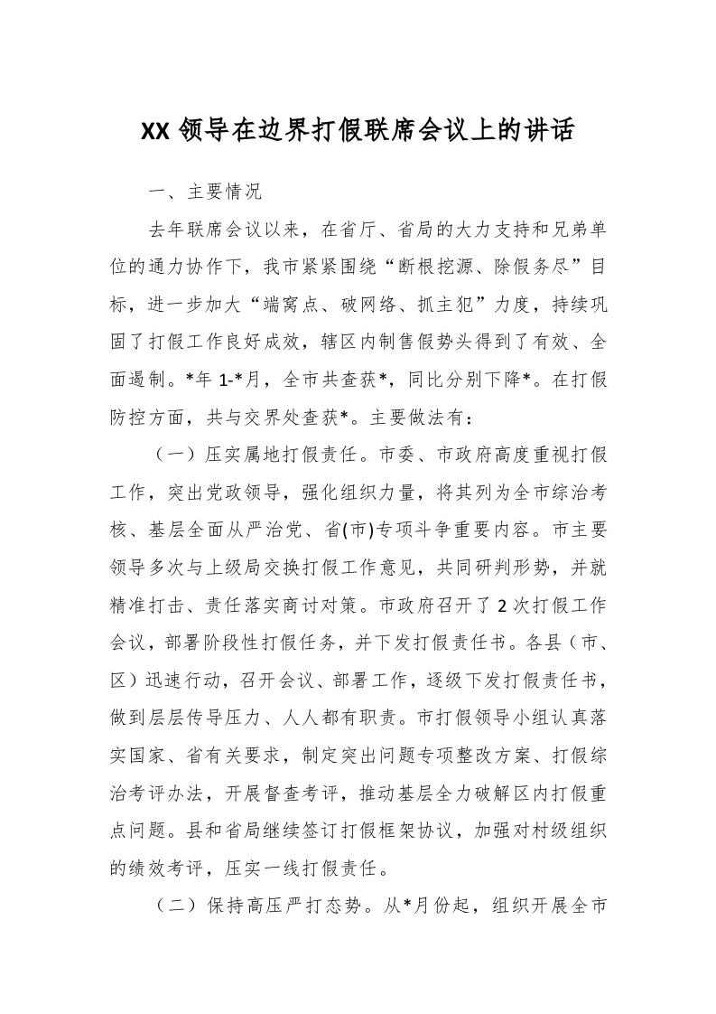/ XX领导在边界打假联席会议上的讲话