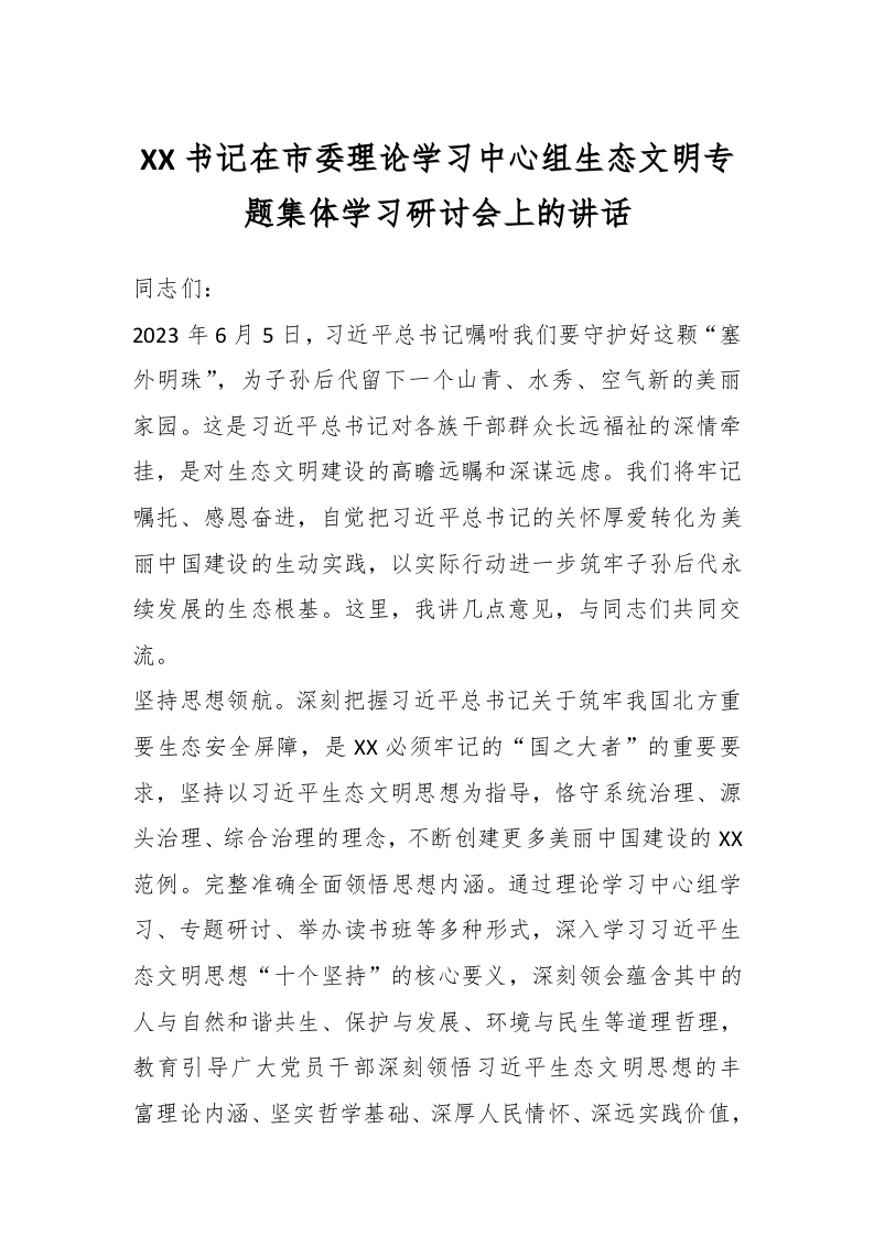 / XX书记在市委理论学习中心组生态文明专题集体学习研讨会上的讲话