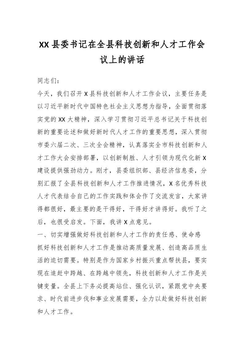 / XX县委书记在全县科技创新和人才工作会议上的讲话