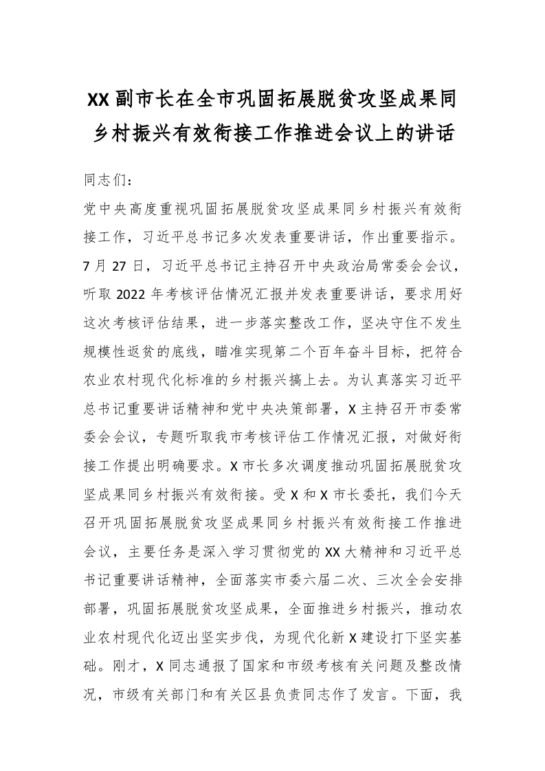 / XX副市长在全市巩固拓展脱贫攻坚成果同乡村振兴有效衔接工作推进会议上的讲话