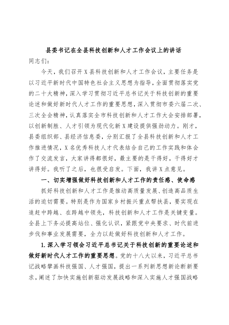 / 县委书记在全县科技创新和人才工作会议上的讲话