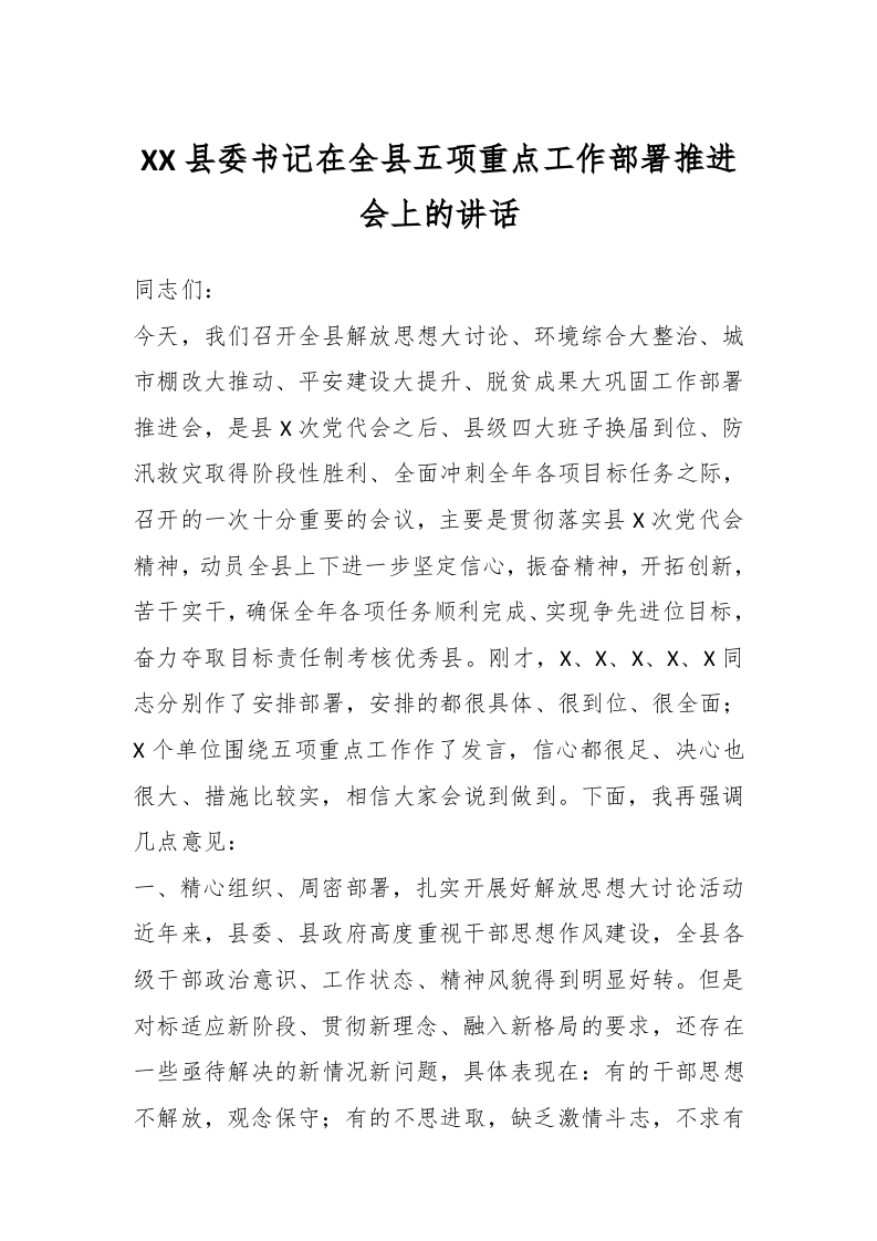 / XX县委书记在全县五项重点工作部署推进会上的讲话