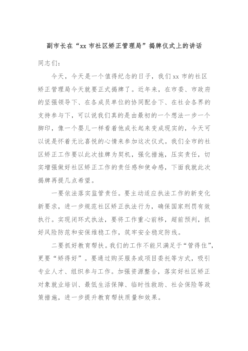 / 副市长在“xx市社区矫正管理局”揭牌仪式上的讲话