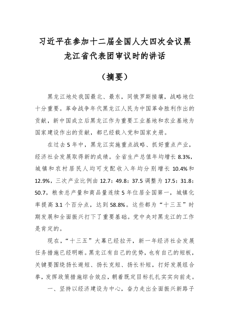 习近平在参加十二届全国人大四次会议黑龙江省代表团审议时的讲话(摘要)