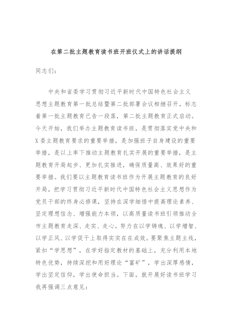 / 在第二批主题教育读书班开班仪式上的讲话提纲