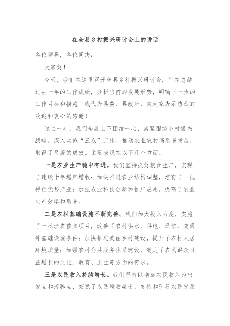 / 在全县乡村振兴研讨会上的讲话